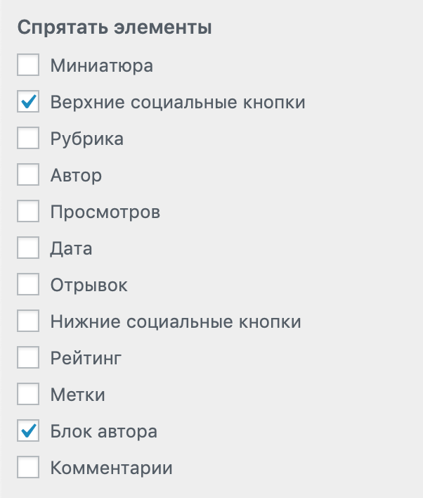 Настройки для постов, вывод сайдбара, возможность скрыть любые элементы, задать количество похожих материалов.